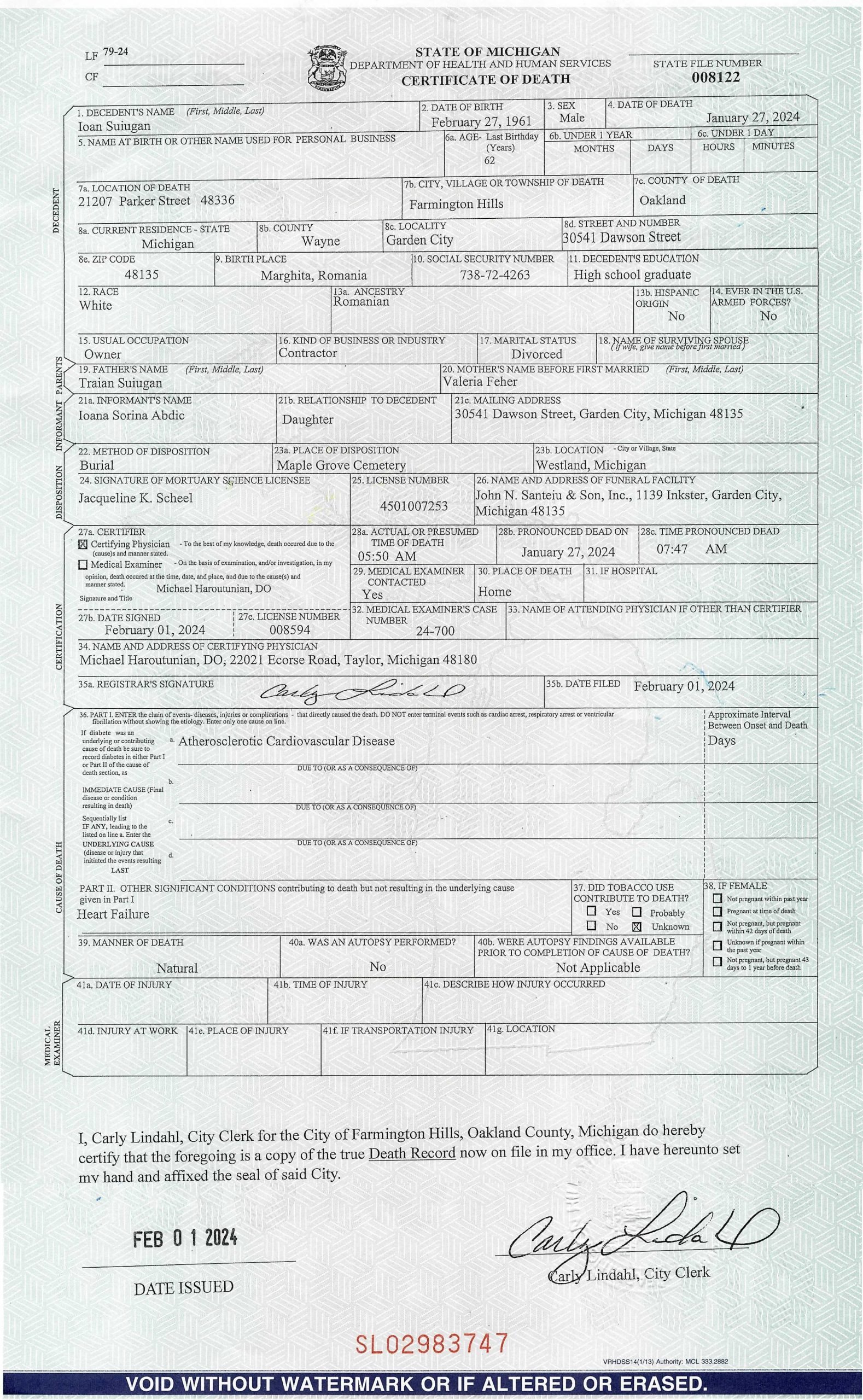 “Ioan Suiugan, was found somewhere in the plant, suffered a massive heart attack, was resurrected and transported to the nearest hospital” Per doctor’s words, at the GM Plant in Tonawanda, Buffalo.